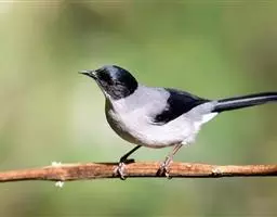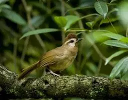 黑顶噪鹛:中型鸟类,体长24-26厘米。前额、脸、颏、喉黑色,头顶黑褐沾棕或深棕橄榄褐色,…