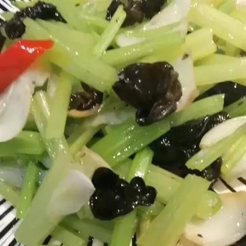 西芹炒木耳是一道菜品,主料有西芹、木耳。芹菜是高纤维食物具有抗癌防癌的功效,木耳又有清肺的功效。