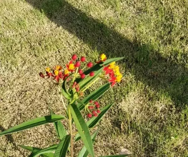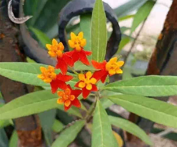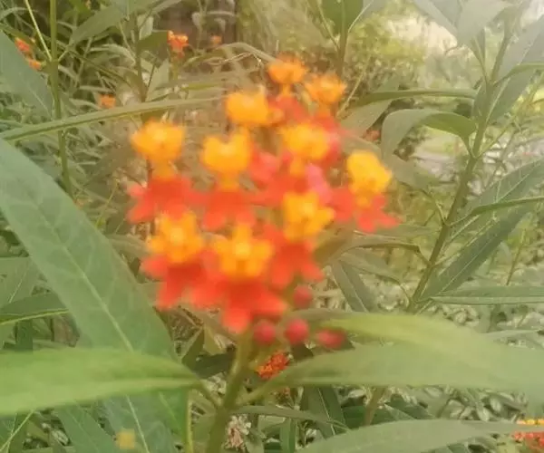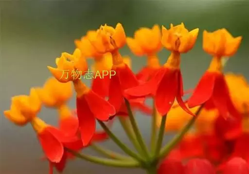 马利筋(Asclepias curassavica L.),又名莲生桂子花、芳草花、水羊角,萝藦科(Asclepiadaceae)宿根多年生草本,灌木状,高达60-120cm。全株含白色体液。叶对生,披针形,全绿。伞形花序着花10余朵;花朵小巧玲珑,花冠朱红色,5深裂;副花冠金黄色,带有角状突起,矗立呈兜状,盛开时轻盈明媚,多姿多彩。花期春至夏季。花后能结果,蓇葖果鹤嘴形,成熟后会裂开,内有多粒棕黑色种子,种子顶端具白色绢质种毛,好像降落伞,随风飘飞,到处播种。