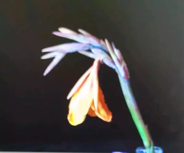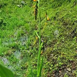 多年生草本;高50-100厘米。球茎扁圆球形,外包有棕褐色网状的膜质包被。叶多基生,剑形,长40-60厘米,基部鞘状,顶端渐尖,中脉明显;茎生叶较短而狭,披针形。花茎常2-4分枝,由多花组成疏散的穗状花序;每朵花基部有2枚膜质的苞片;花两侧对称,橙黄色,直径3.5-4厘米;花被管略弯曲,花被裂片6,2轮排列,披针形或倒卵形,长约2厘米,宽约5毫米,内轮较外轮的花被裂片略宽而长,外轮花被裂片顶端略尖;雄蕊3,长1.5-1.8厘米,偏向花的一侧,花丝着生在花被管上,花药“丁”字形着生;花柱长2.8-3厘米,顶端3裂,柱头略膨大。蒴果三棱状球形。花期7-8月,果期8-10 月。