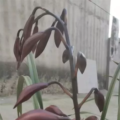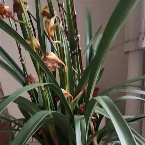 花葶从假鳞茎上部节上发出,近直立,长27-70厘米;总状花序长(5-)10-25厘米,具5-22朵花;花苞片披针形至卵状披针形,长(3-) 5-12毫米;花梗和子房(3-) 5-9毫米;花常偏花序一侧,多少下垂,不完全开放,有香气,狭钟形,淡紫褐色;萼片倒披针形,从中部向基部骤然收狭而成近狭线形,全长2-3厘米,上部宽3.5-5毫米,先端急尖或渐尖;侧萼片略斜歪。