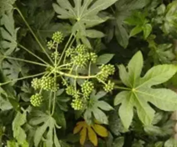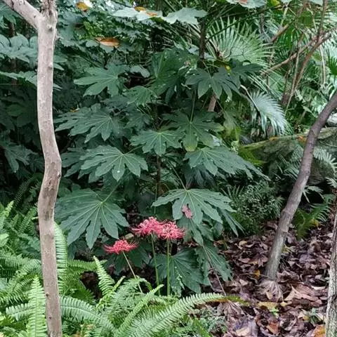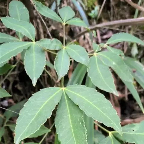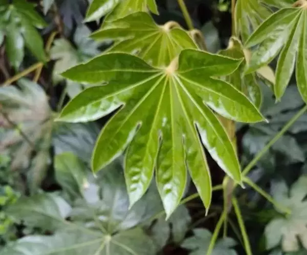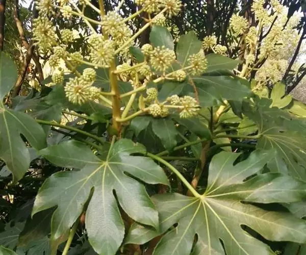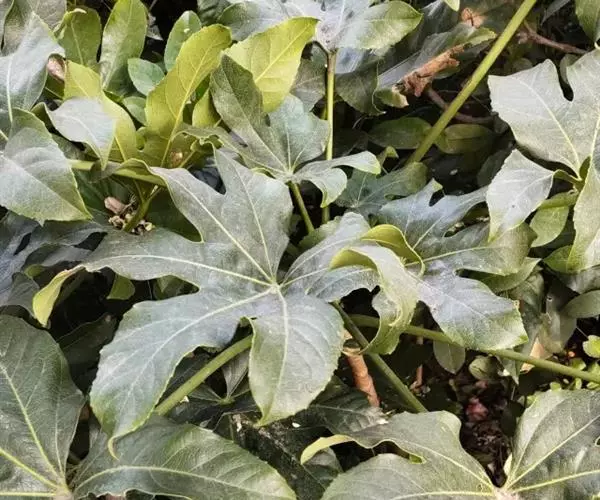 八角金盘,因其掌状的叶片,裂叶约8片,看似有8个角而名。它叶丛四季油光青翠,叶片象一只只绿色的手掌。其性耐荫,在园林中常种植于假山边上或大树旁边,还能作为观叶植物用于室内,厅堂及会场陈设。叶或根皮可入药,性温味辛、苦,具有化痰止咳,散风除湿,化瘀止痛之功效。常用于咳喘,风湿痹痛,痛风,跌打损伤。