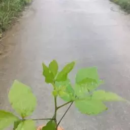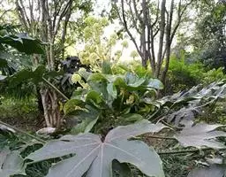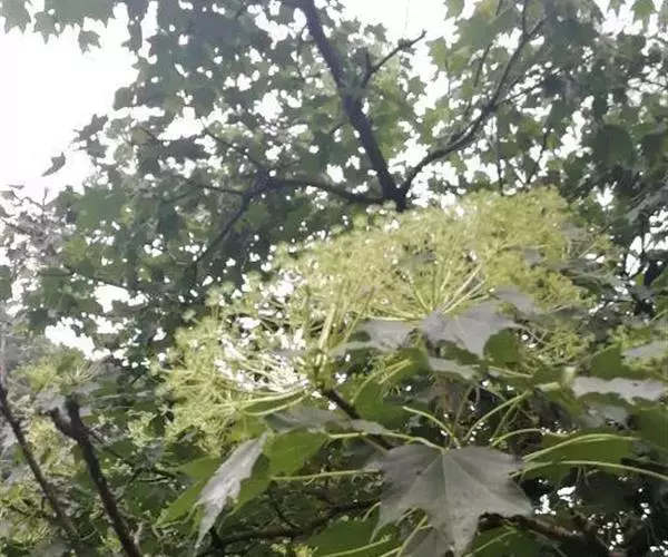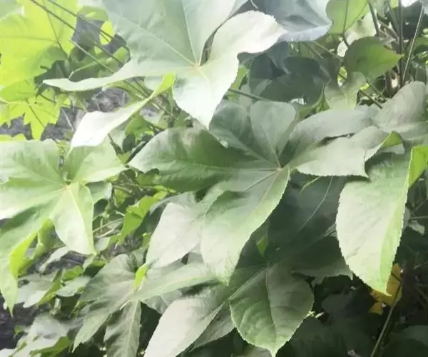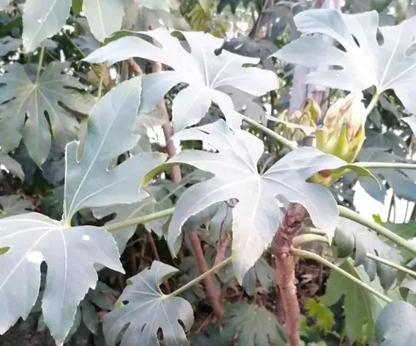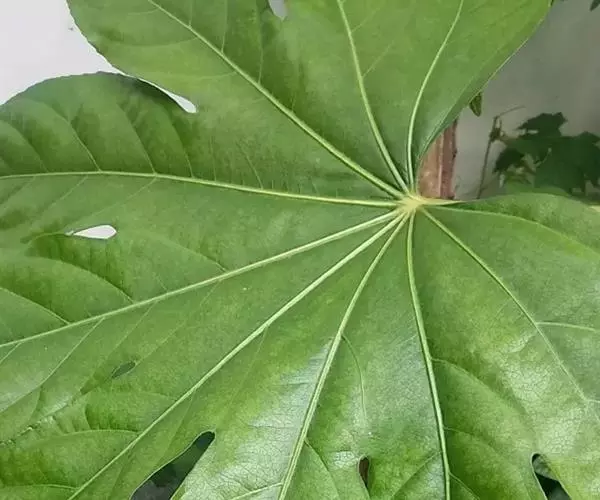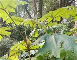 常绿灌木或小乔木,高可达5m。茎光滑无刺。叶柄长10-30cm;叶片大,革质,近圆形,直径12-30cm,掌状7-9深裂,裂片长椭圆状卵形,先端短渐尖,基部心形,边缘有疏离粗锯齿,上表面暗亮绿以,下面色较浅,有粒状突起,边缘有时呈金黄色;侧脉搏在两面隆起,网脉在下面稍显着。