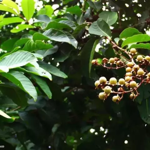 圆锥花序顶生,长20-40cm;伞形花序直径3-5cm,花序轴被褐色绒毛;花萼近全缘,无毛;花瓣5,卵状三角形,长2.5-3mm,黄白色,无毛;雄蕊5,花丝与花瓣等长;子房下位,5室,每室有1胚球;花柱5,分离;花盘凸起半圆形。果实近球形,直径5mm,熟时黑色。花期10-11月,果熟期翌年4月。
