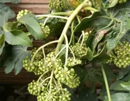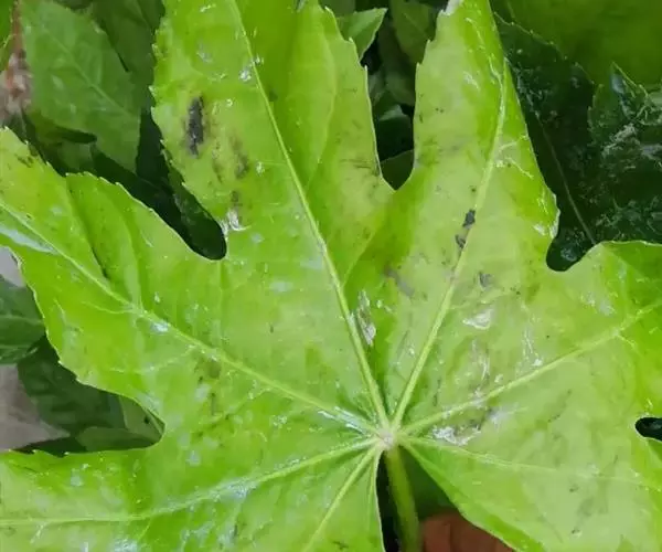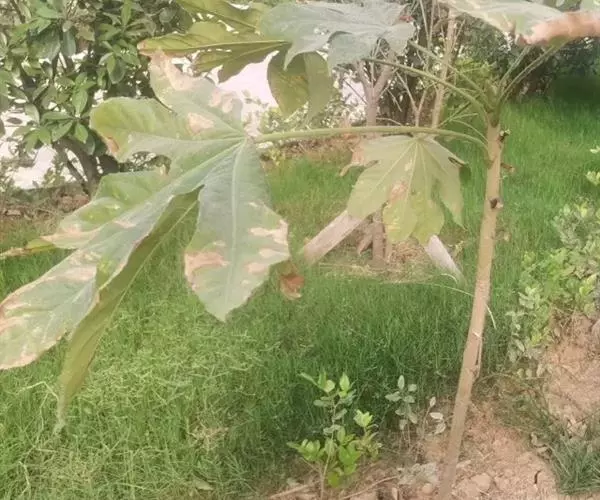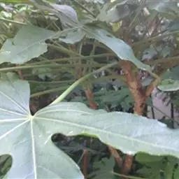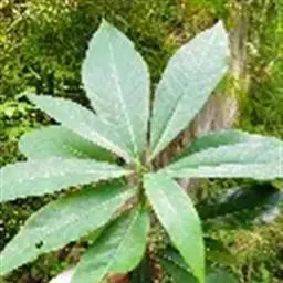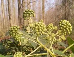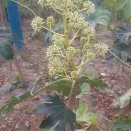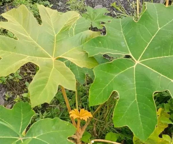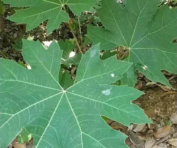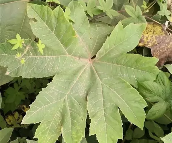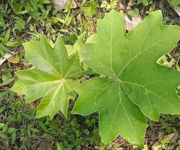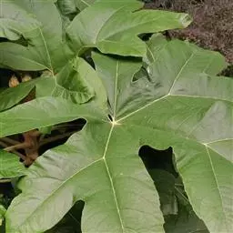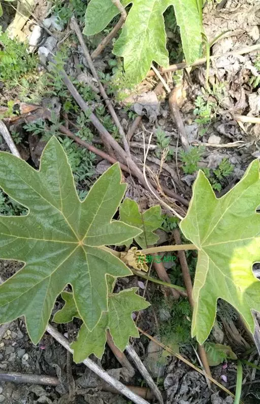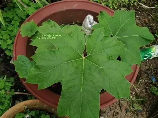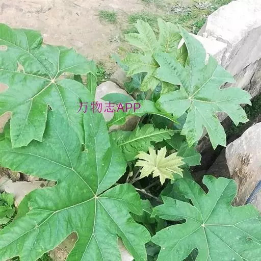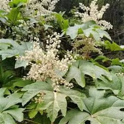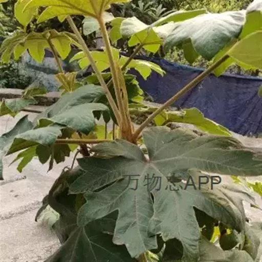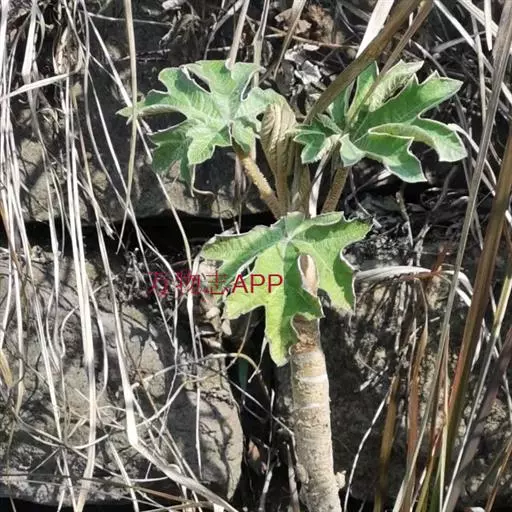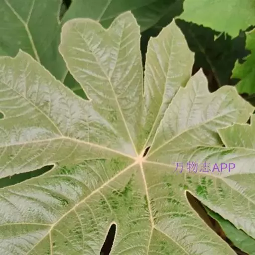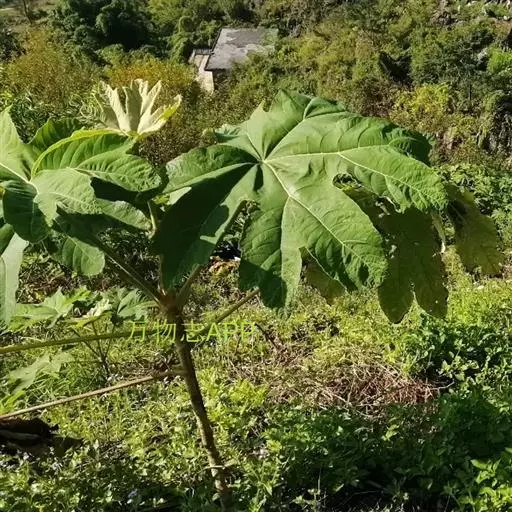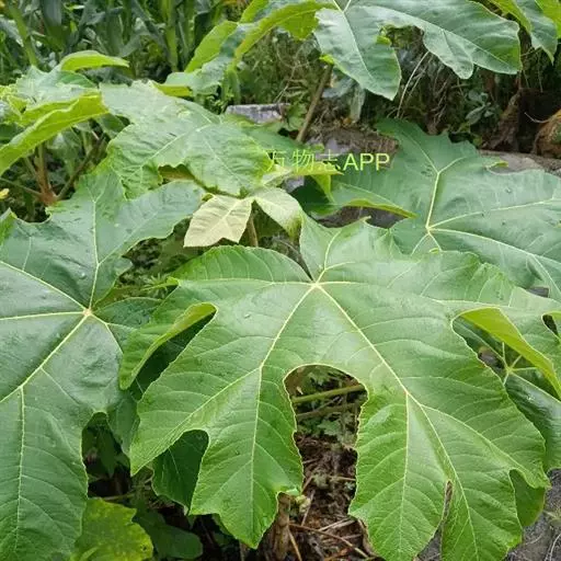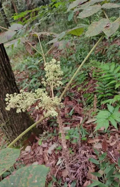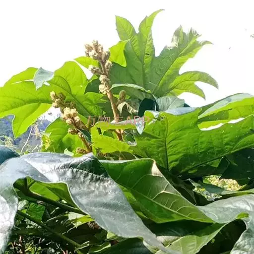 版本二: 常 绿灌木或小乔木,高1-3.5米,基部直径6-9厘米;树皮深棕色,略有皱裂;新枝淡棕色或淡黄棕色,有明显的叶痕和大形皮孔,幼时密生黄色星状厚绒毛,后毛渐脱落。叶大,集生茎顶;叶片纸质或薄革质,长50-75厘米,宽50-70厘米,掌状5-11裂,裂片通常为叶片全长的1/3或1/2,稀至2/3,倒卵状长圆形或卵状长圆形,通常再分裂为2-3小裂片,先端渐尖,上面深绿色,无毛,下面密生白色厚绒毛,边缘全缘或疏生粗齿,侧脉和网脉不明显;叶柄粗壮,长30-50厘米,无毛;托叶和叶柄基部合生,锥形,长7.5厘米,密生淡棕色或白色厚绒毛。圆锥花序长50厘米或更长;分枝多,长15-25厘米;苞片披针形,长1-3.5厘米,密生白色或淡棕色星状绒毛;伞形花序直径1-1.5厘米,有花多数;总花梗长1-1.5厘米,花梗长3-5毫米,均密生白色星状绒毛;小苞片线形,长2-6毫米;花淡黄白色;萼长1毫米,边缘全缘或近全缘,密生白色星状绒毛;花瓣4,稀5,三角状卵形,长2毫米,外面密生星状厚绒毛;雄蕊和花瓣同数,花丝长约3毫米;子房2室;花柱2,离生,先端反曲。果实直径约4毫米,球形,紫黑色。花期10-12月,果期次年1-2月。