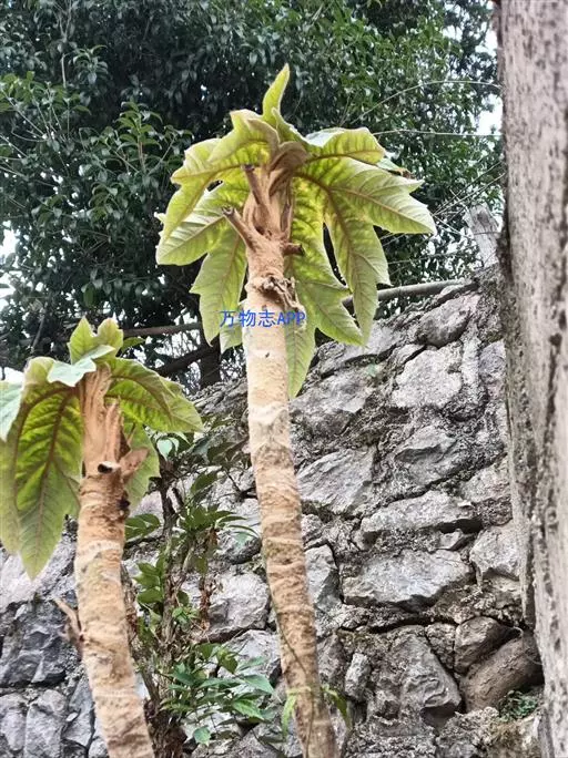版本一:五加科常绿灌木或小乔木,高1-3.5m。茎粗壮,不分枝,幼稚时表面密被黄色星状毛或稍具脱落的灰黄色柔毛。茎贿大,白色,纸质;树皮深棕色,略有皱裂;新枝淡棕色或淡黄棕色,有明显的叶痕和大型皮孔。叶大,互生,聚生于茎顶;叶柄粗壮,圆筒形,长30-50cm;托叶膜质,锥形,基部与叶柄合生,有星状厚绒毛;叶片纸质或薄革质,掌状5-11裂,裂片通常为叶片全长的1/3-1/2,稀至2/3,倒卵状长圆形卵状长圆形,每一裂片常又有2-3个小裂片,全缘或有粗齿,上面深绿色,无毛,下面密被白色星状绒毛。伞形花序聚生成顶生或近顶生大型复圆锥花序,长达50cm以上;萼密被星状绒毛,全缘或近全缘;花瓣4,稀5,三角状卵形,长2mm,外面密被星状厚绒毛;雄蕊5,与花瓣同数;子房下位,2室,花柱2,离生,先端反曲。果球形,直径约4mm,熟时紫黑色。花期10-12月,果期翌年1-2月。