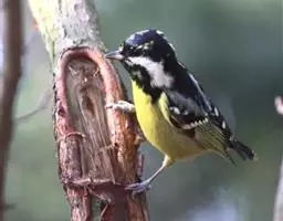 黄颊山雀是雀形目山雀科山雀属鸟类。雄鸟额、头顶和羽冠为具有光泽的黑色;额基、眼先、眉纹、脸颊和耳羽等头颈侧为鲜艳的明黄色;贯眼纹黑色;后颈亦具一黄斑;上体灰黄绿色,羽缘黑色;尾羽黑色具蓝灰色羽缘,基部白色;下体颏、喉至上胸为富有金属光泽的黑色;胸下有一黑色宽中央纵纹,一直延伸至肛周;其余下体白色;胸侧和两胁染黄色或蓝灰色;虹膜暗褐色;喙黑色;脚铅蓝灰色至铅黑色。雌鸟似雄鸟,但上体光泽较弱,胸腹部黑色纵带不明显。黄颊山雀分布于亚洲东南部地区,在中国分布于华中、华南和西南等地。栖息于中低山常绿阔叶林、针叶林和混交林中,也见于山麓疏林灌丛草坡或茶园、果园等地。常成对或小群活动,也和大山雀等其他小型鸟类混群,活跃地在乔灌木枝叶间飞翔跳跃。主食鳞翅目和鞘翅目等昆虫,兼食植物种实。繁殖期在4-6月,营巢于树洞、岩隙或墙缝中。窝卵数为3-7枚,卵灰白色且有红褐斑,雏鸟晚成。黄颊山雀被列入中国林业局200