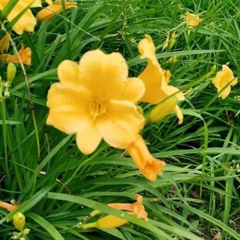 金娃娃萱草:是萱草的人工栽培的园艺品种。地下具根状茎和肉质肥大的纺锤状块根。叶基生,条形,排成两列,…