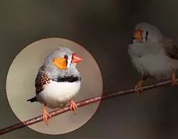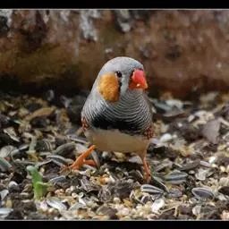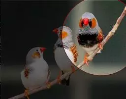 橙颊梅花雀体长约10厘米,头部灰色,两侧有大块橙色区域,嘴基及眼下方有黑纹,两条黑纹间呈白色,…