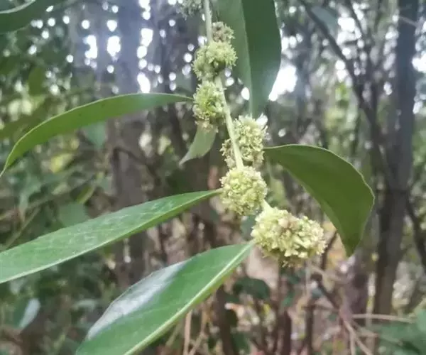 穗状花序基部有分枝,长约6厘米,其分枝长约3厘米,密被短柔毛;苞片卵形,长约3毫米,小苞片横椭圆形,宽约3毫米;花萼5裂,长约4毫米,无毛,裂片圆形,稍长于萼筒或等于萼筒,有缘毛;花冠白色,长约6毫米,5深裂几达基部,有极短的花冠筒,裂片椭圆形;雄蕊40-50枚,花丝基部联生成五体雄蕊;花盘有毛和腺点,花柱长约3毫米,柱头盘状。核果长圆形,长约15毫米,直径约8毫米,顶端宿萼直立,核骨质,分开成3分核。花期3-4月,果期8-10月。