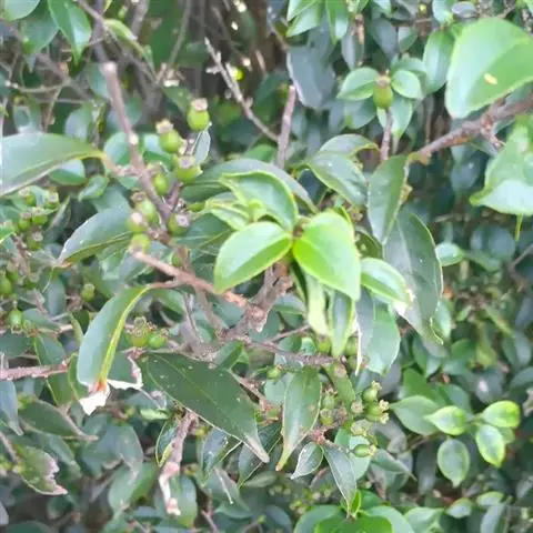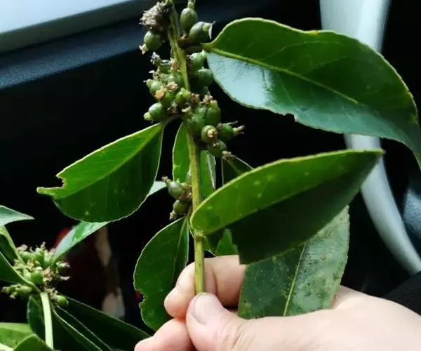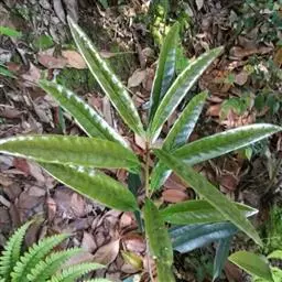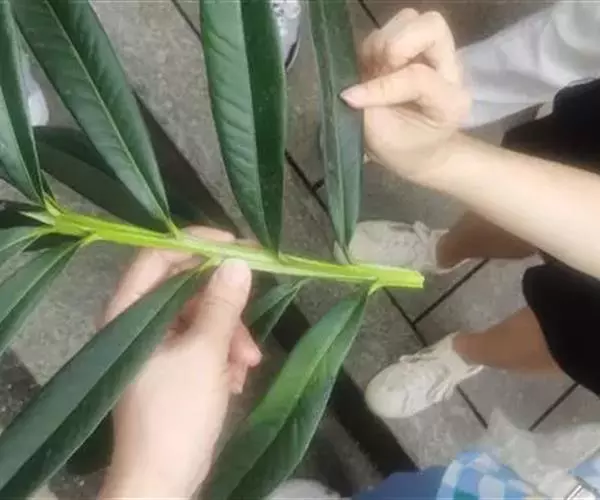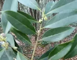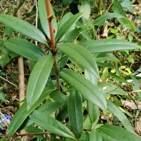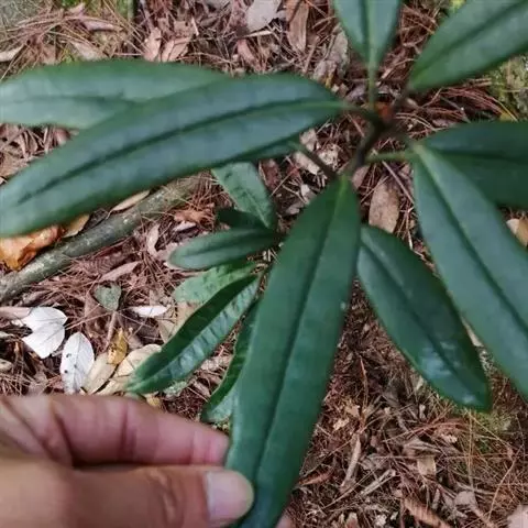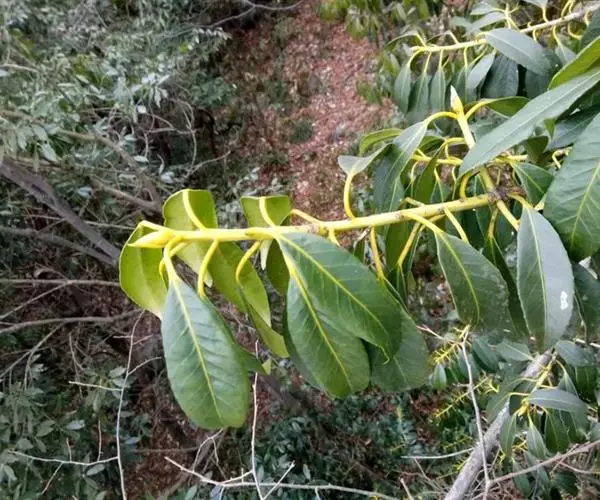 乔木。小枝黄绿色,粗壮,具4-5条棱。叶革质,狭椭圆形,长12-14厘米,宽3-5厘米,先端急尖,基部楔形,边缘具粗浅齿,两面均黄绿色;中脉在叶面凸起,侧脉每边9-14条,纤细,在叶面不明显,在叶背明显凸起;叶柄长约1厘米。