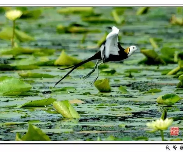 水雉生活在热带及亚热带的开放性湿地中,主要为淡水湖沼。因其有细长的脚爪,能轻步行走于睡莲、荷花、菱角、芡实等浮叶植物上,且体态优美,羽色艳丽,被美称为“凌波仙子”。