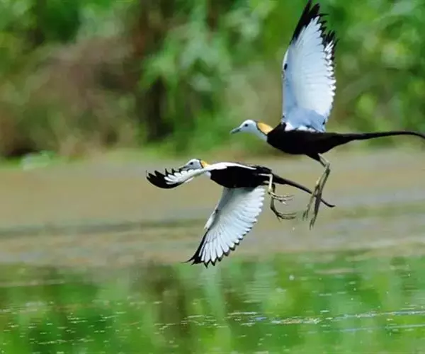 水雉每年的四月末进入繁殖季节,更换上黑白相间十分醒目的繁殖羽,一直到八月末陆陆续续退下繁殖羽换上黄褐色的冬羽,才宣告繁殖季节的结束。水雉在换羽过程中,飞羽一次全部脱落,失去飞翔能力。待飞羽长成后,才能恢复飞翔。