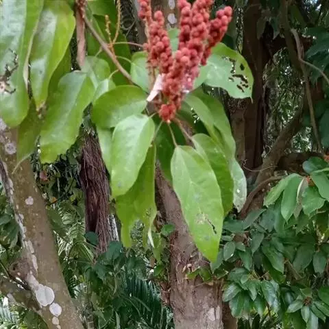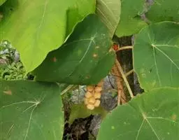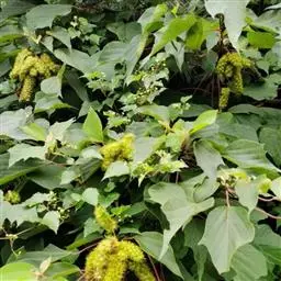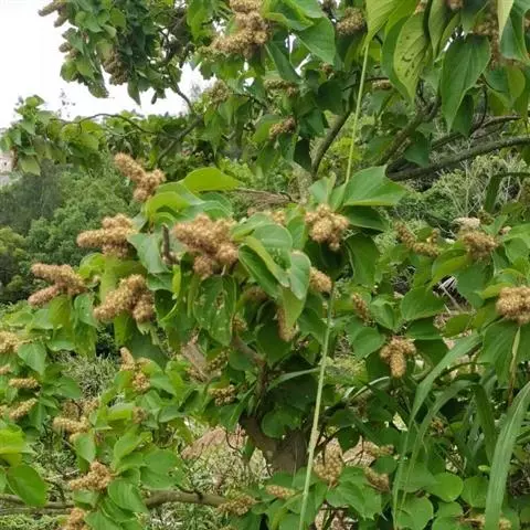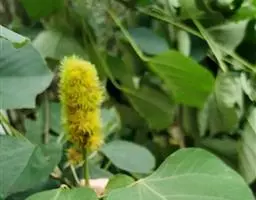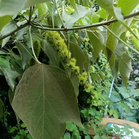 花雌雄异株;雄花序总状,顶生,长4-12厘米,苞片卵状披针形,长2-3毫米,雄花(1-)2-5朵簇生于苞腋,花梗长约3毫米;雄花:花蕾卵形,长约1.5毫米,花萼裂片3枚,阔卵形,不等大,长约1.5毫米,无毛;雄蕊25-45枚,药隔宽。雌花序总状,顶生,长7-10厘米,苞片钻形,长约2毫米,被毛,花梗长约2.5毫米;雌花:花萼佛焰苞状,长约4.5毫米,一侧开裂,顶端3齿裂,外面被星状毛和疏生黄色颗粒状腺体;子房球形,密生软刺和微柔毛,花柱中部以下合生,柱头长4-5毫米,密生羽毛状突起。蒴果扁球形。直径约1.4厘米,具3个分果爿,具3纵槽,被微柔毛和橙黄色颗粒状腺体,疏生稍弯的软刺;种子球形,直径约5毫米,具斑纹。花期2-4月,果期6-11月。