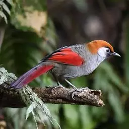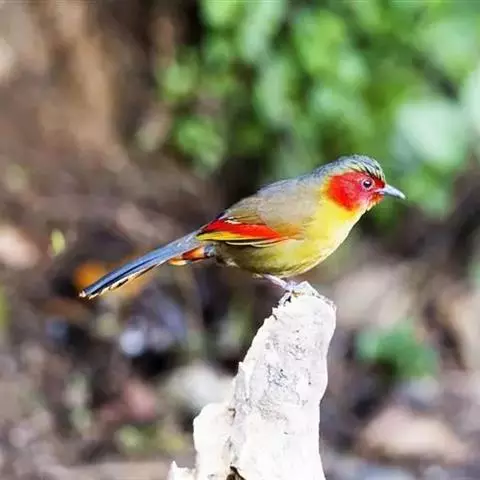 赤尾噪鹛中型鸟类,体长24~28厘米。头顶至后颈红棕色,两翅和尾鲜红色,眼先、眉纹、颊、颏和喉黑色,…