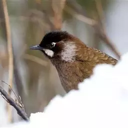 黑顶噪鹛:中型鸟类,体长24-26厘米。前额、脸、颏、喉黑色,头顶黑褐沾棕或深棕橄榄褐色,…