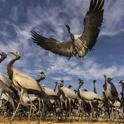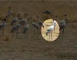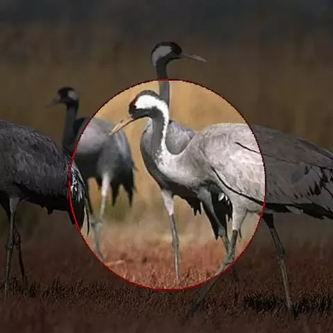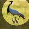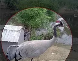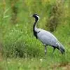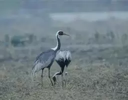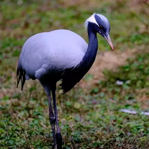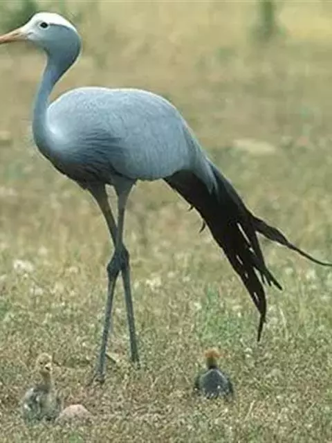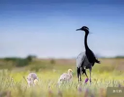 蓑羽鹤大型涉禽,体长68~92厘米,是鹤类中个体最小者。通体蓝灰色,眼先、头侧、喉和前颈黑色,…