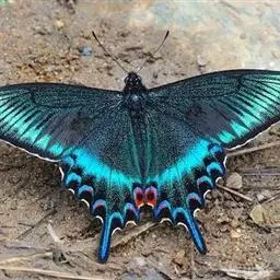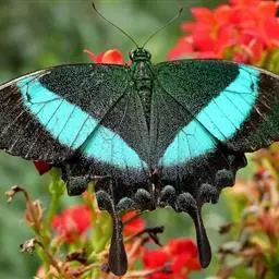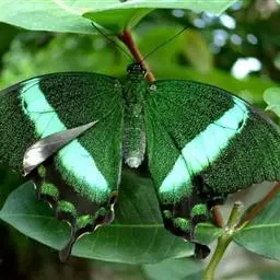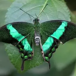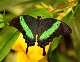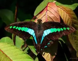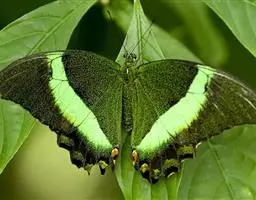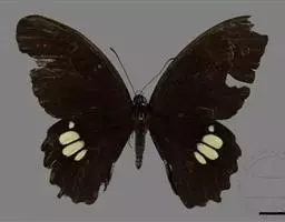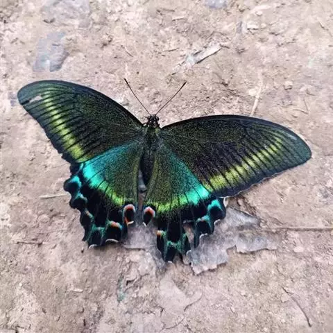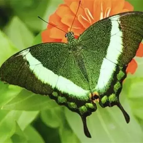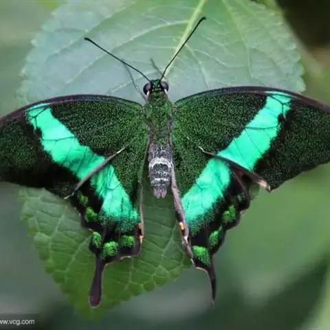 巴黎翠凤蝶中型凤蝶,躯体黑褐色,散布绿色亮鳞。后翅M3脉端有一明显叶状尾突。翅背面底色黑褐色,密布…