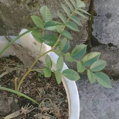 叶长4-8厘米;叶柄上无腺体;叶轴上每对小叶间有棒状的腺体1枚;小叶3对,膜质,倒卵形或倒卵状长椭圆形,长2-6厘米,宽1.5-2.5厘米,顶端圆钝而有小尖头,基部渐狭,偏斜,上面被稀疏柔毛,下面被柔毛;小叶柄长1.5-2毫米;托叶线状,被柔毛,早落。