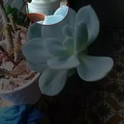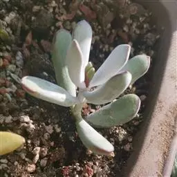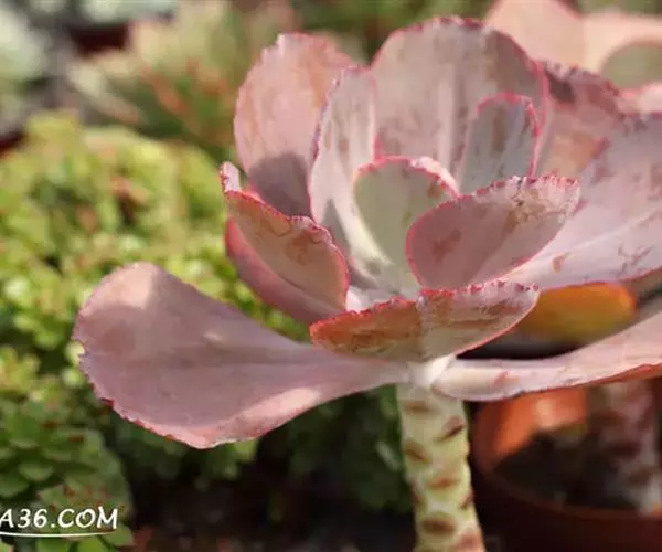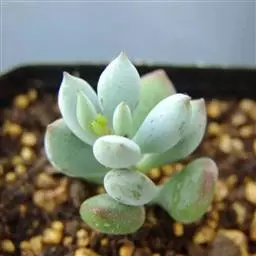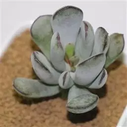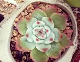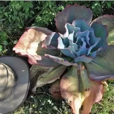 大瑞蝶茎部粗壮,会随着生长而逐渐伸长。叶片莲座型松散排列,株径可达15cm以上。叶片长圆形,有较尖的红色叶尖,叶缘光滑,叶片有点肥厚,叶面中间有凹槽。叶色蓝绿至蓝白色,新叶色蓝、老叶色绿,主要是白粉脱落了。强光与昼夜温差大或冬季低温期大瑞蝶叶色蓝白,弱光则叶色蓝绿。叶缘常会显现粉红色,温差大的时候红色更加明显。叶面上覆有白粉,老叶白粉掉落後呈光滑状。初夏开花,穗状花序长度可达30㎝以上,开橘色钟形花朵。