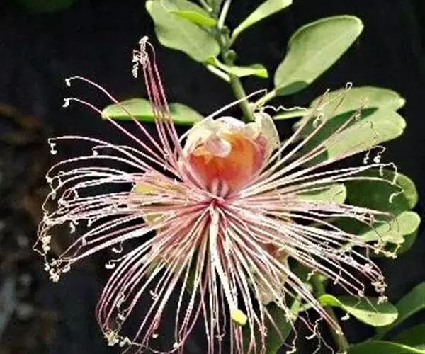 花具短而粗壮的梗;萼筒平滑无棱,浅杯状,果时碟形,裂片平展,通常6,内面绿色或黄白色,比萼筒长,花瓣条状披针形,暗红色,长1.8-2厘米,宽0.25-0.3厘米;花丝粉红色或上部白色,下部红色,长2.5-3厘米;花柱长3-3.5厘米,柱头头状。成熟的果实直径4-5厘米。花期冬季,果期春夏季。