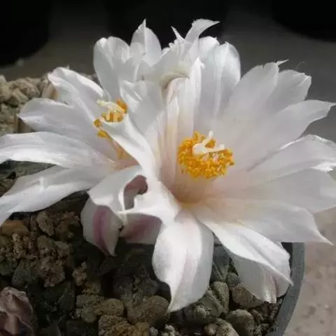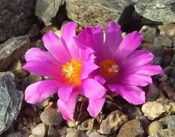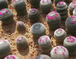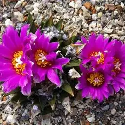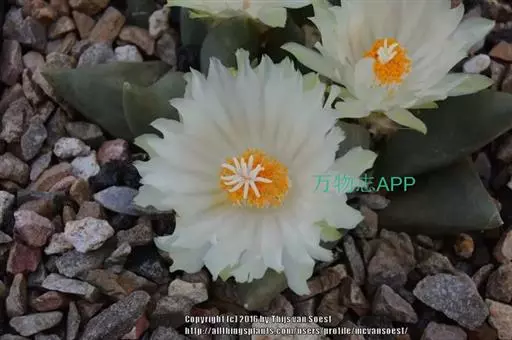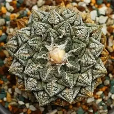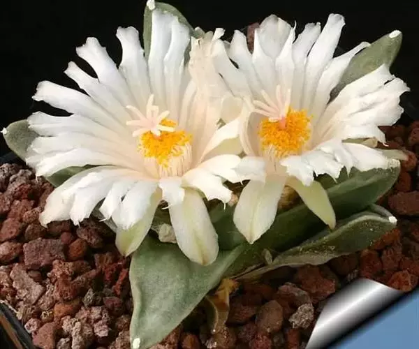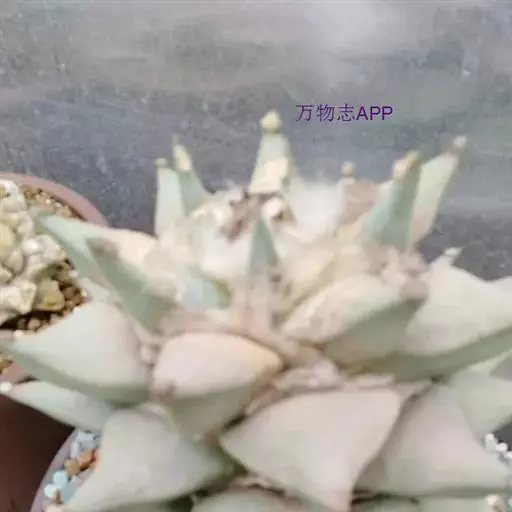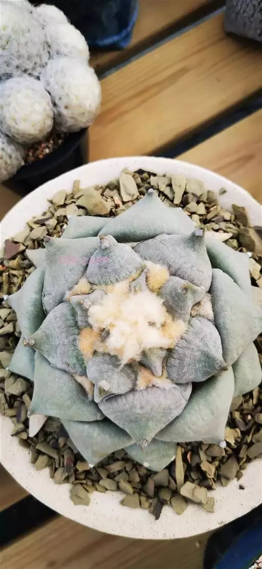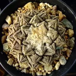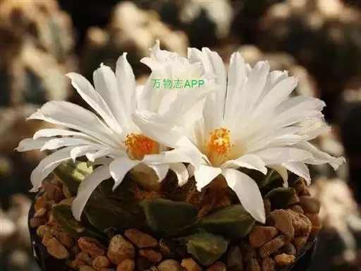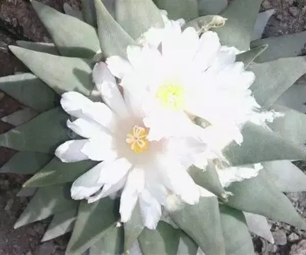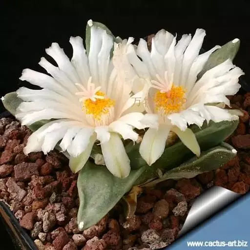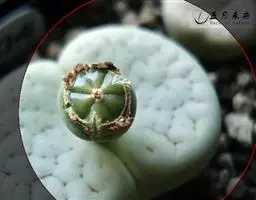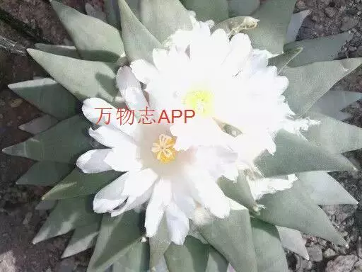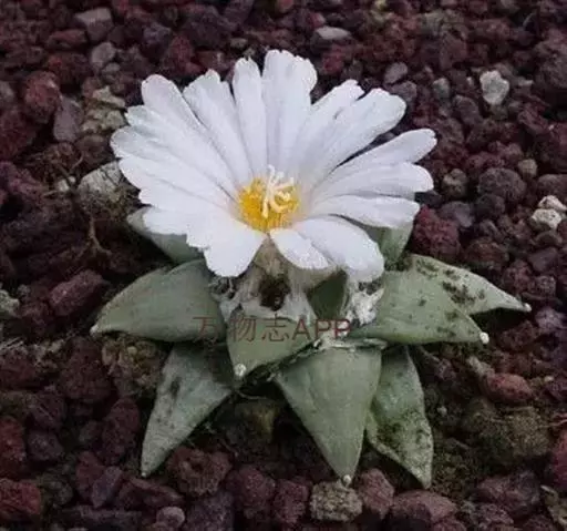 岩牡丹(Ariocarpus retusus) 原产地:墨西哥北部,是生长在亚热带的肉质仙人掌,岩牡丹半埋藏于土中,有着很大的主根。上部份扁平,直径为6-12厘米,有三角形的结节,重叠形成横向的皱纹。岩牡丹完全没有冠,及呈灰色,在其生长地很易收藏自己。岩牡丹顶有毛,生长几年后会长出粉红色或黄色的大花朵。岩牡丹含有苦味及有毒的生物碱,如大麦芽碱。这些生物碱可以保护植物本身免于草食性的动物所吃。