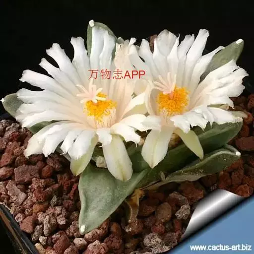 无刺的仙人掌类植物,具肥厚的直根。植株呈球形或扁球形,灰绿色,被白粉。有许多疣状突起,疣状突起呈莲座状,绿色或灰绿色,表面被白粉,上扁平或微凹,平滑;外观上看没有刺,事实上植株中部刚长出的疣突是有刺的,但很小而且早衰,所以看上去没有。疣突间有白色或淡黄色绵毛 。夏季开花,花生于茎中心处,花被片白色;浆果光滑,以后变干,种子黑色 。
