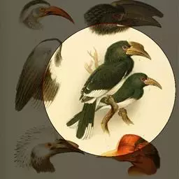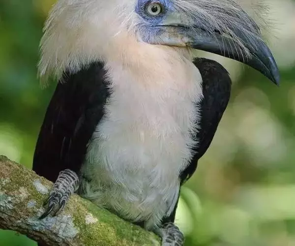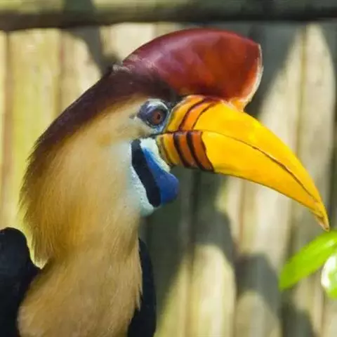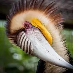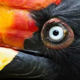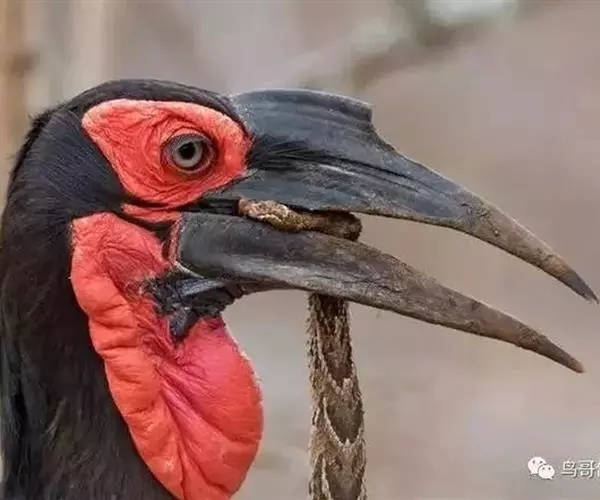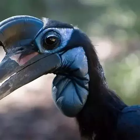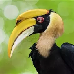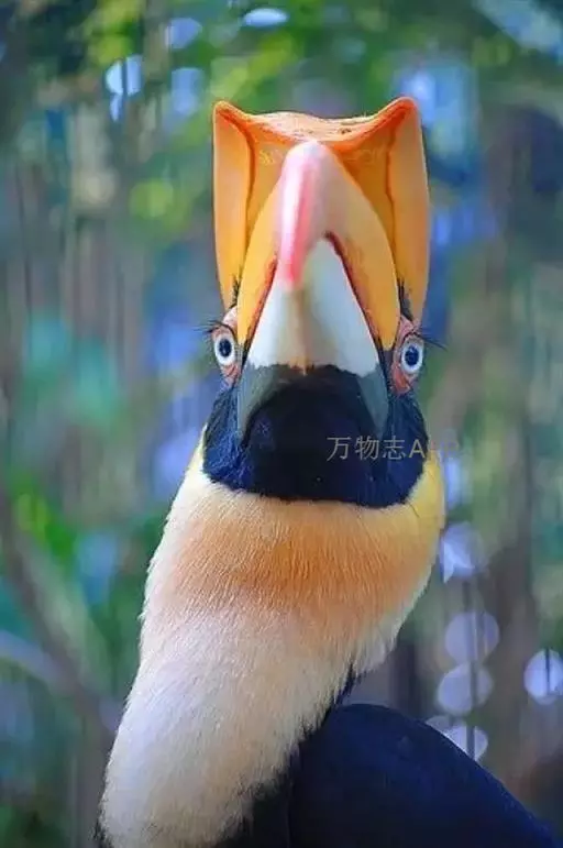 犀鸟 犀鸟一般头大,颈细,翅宽,尾长。羽衣棕色或黑色,通常具鲜明的白色斑纹。体长在70~120厘米左右,嘴就长达35厘米,占了身长的1/3到一半,一双大眼睛上长有粗长的眼睫毛,这是其它鸟类中所少有的。它的大嘴和盔突显得很笨重,其实非常灵巧。 采食浆果、捕食老鼠昆虫、修建巢穴等等工作大嘴都能灵巧地完成。