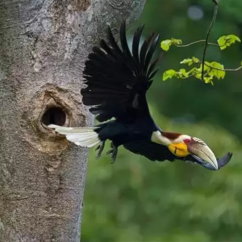 每年春季以后,成对的犀鸟,便选择高大的树干上的洞穴作巢,一般都是利用白蚁蛀蚀或树木天长日久朽蚀后形成的大洞。