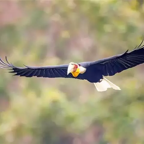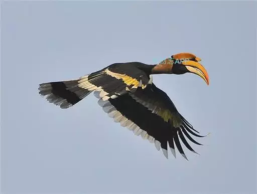 在西双版纳的密林中,身型庞大的犀鸟,飞行速度较慢,飞翔时翅膀发出极大的声响,就像天上过飞机一样,而且停落在树顶时,不时地发出响亮而粗历的鸣叫声,连续不断,能传出很远,如同马嘶一般。