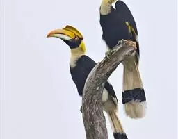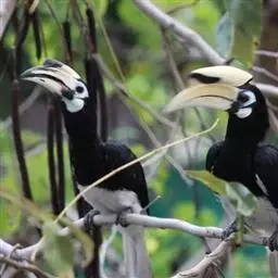 左图.冠斑犀鸟 右图双角犀鸟 因嘴呈象牙色,外形又像犀的角,故称为犀鸟。我国有4种:白喉小盔犀鸟(Ptilolaemus tickelli)、双角犀鸟(Buceros bicornis)、棕颈无盔犀鸟(Aceros nipalensis)和冠斑犀鸟(Anthracoceros coronatus)。冠斑犀鸟最为常见,体长约75~80厘米。背面羽毛纯黑,具有绿色金属光泽。翼缘、飞羽和尾羽先端白色。雄鸟嘴长大而下弯,约长15厘米,嘴上端的基部具有高大轻而坚固的盔突,雌鸟的盔突较小。嘴和盔突内为疏松的骨质纤维,故轻坚而灵巧。眼睑边缘有长形睫毛。常栖息于干燥森林中的巨木上,以果实、昆虫为食。在生殖季节,最为奇特的是雌鸟自选树洞,雄鸟衔泥等物在洞外协助封闭洞口,雌鸟在已封口的树洞内孵卵育雏;雄鸟担负在裂缝式的洞口处喂食。每窝孵卵2~4个,雌鸟直至雏鸟能出飞时方换羽外出。我国仅云南西部以及南部西双版纳和广西南部有此鸟。为留鸟。由于珍稀,所有种均被列为国家二级保护动物。