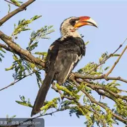 红嘴弯嘴犀鸟 犀鸟是一种珍贵而漂亮的鸟类,一般寿命在30~40岁左右,最高寿的可达50岁。