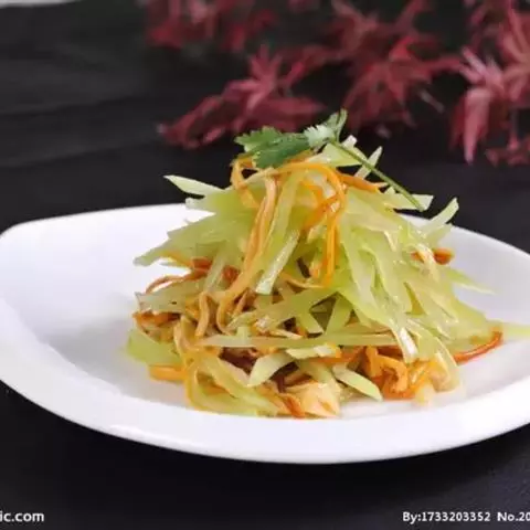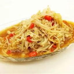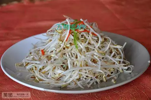 【原料】:绿豆芽、胡萝卜、姜、醋、盐、香油、辣椒油。