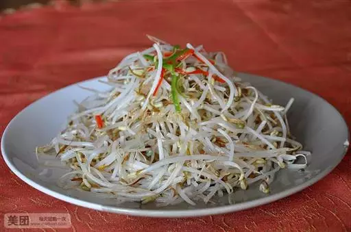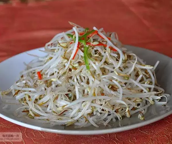 ⒊取一大盘,将豆芽倒入盘中,加盐、味精、醋、香油拌匀即成。