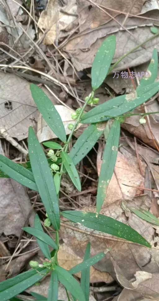 蜜甘草 一年生草本,高达60厘米;茎直立,常基部分枝,枝条细长;小枝具棱;全株无毛。叶片纸质,椭圆形至长圆形,长5-15毫米,宽3-6毫米,顶端急尖至钝,基部近圆,下面白绿色;侧脉每边5-6条;叶柄极短或几乎无叶柄;托叶卵状披针形。