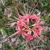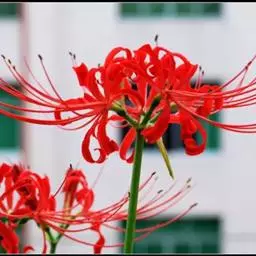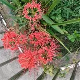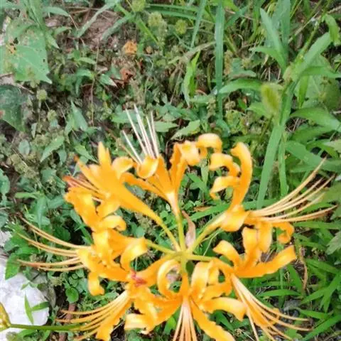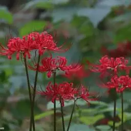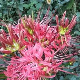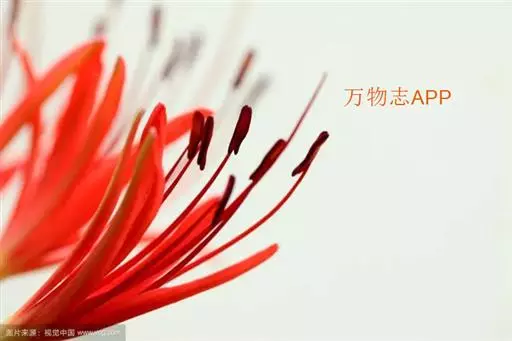 石蒜(学名:Lycoris radiata (L’Her.) Herb.):鳞茎近球形。秋季出叶,叶狭带状,顶端钝,深绿色,中间有粉绿色带;花茎高约30厘米;总苞片2枚,披针形;长约35厘米,宽约05厘米;伞形花序有花4-7朵;花鲜红色;花被裂片狭倒披针形,长约3厘米,宽约05厘米,强度皱缩和反卷;花被简绿色,长约05厘米;雄蕊显著伸出于花被外,比花被长1倍左右。花期8-9月,果期10月。