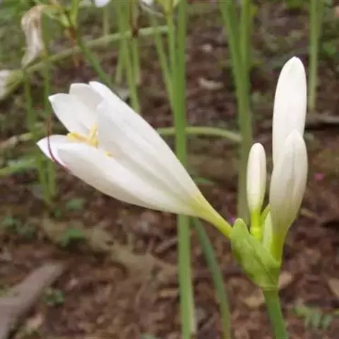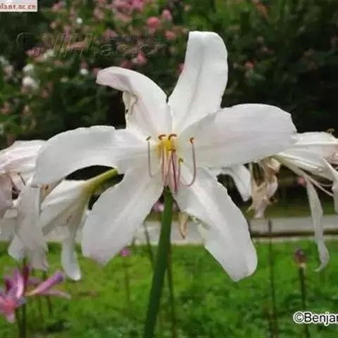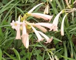 长筒石蒜草本,地生。鳞茎卵球形;叶披针形;伞形花序,有花5-7朵,花白色;花被裂片腹面稍有淡红色条纹,…