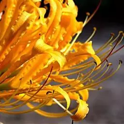 石蒜是多年生草本植物,鳞茎近球形,直径1-3厘米。秋季出叶,叶狭带状,长约15厘米,宽约0.5厘米,顶端钝,深绿色,中间有粉绿色带。花茎高约30厘米;总苞片2枚,披针形,长约35厘米,宽约05厘米;伞形花序有花4-7朵,花鲜红色;花被裂片狭倒披针形,长约3厘米,宽约05厘米,强度皱缩和反卷,花被简绿色,长约05厘米;雄蕊显著伸出于花被外,比花被长1倍左右。花期8-9月,果期10月。