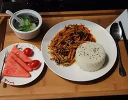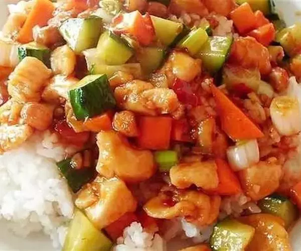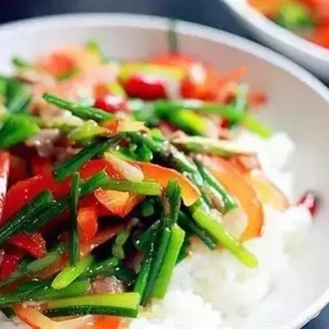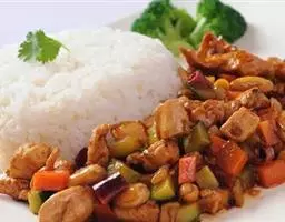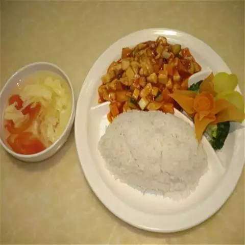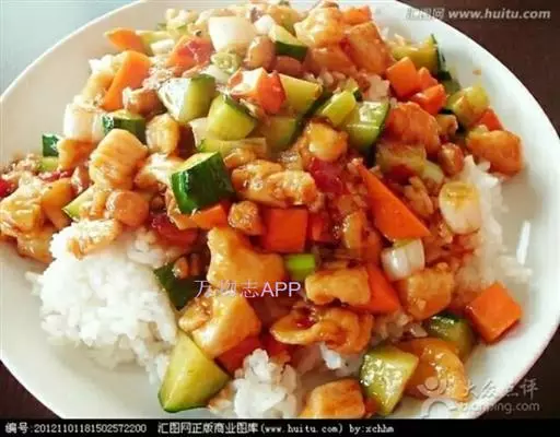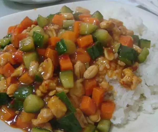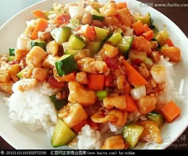 宫保鸡丁盖饭是一道简单的家常饭,主料是鸡胸肉、青笋、胡萝卜、大蒜、葱、干辣椒、盐、味精、胡椒粉、糖、醋、老抽、料酒、淀粉,热白饭一碗。