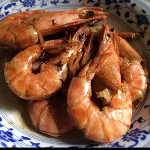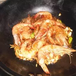 炒大虾是一道菜品,制作原料有大对虾、葱段、姜片等,用微火焖烤透,再将勺移正火,收汁微浓时放入味精,…