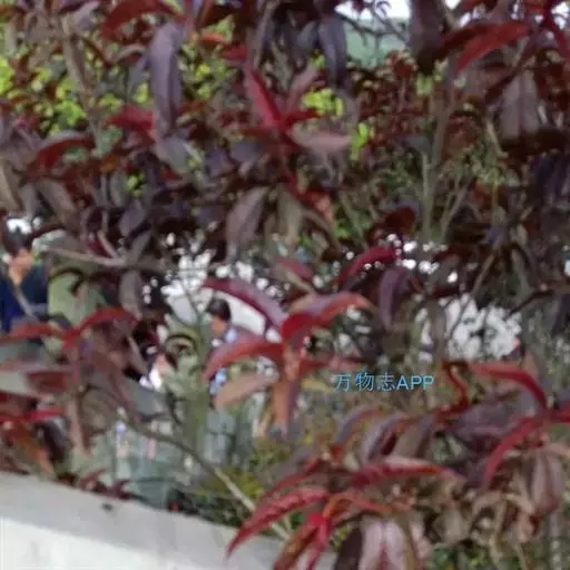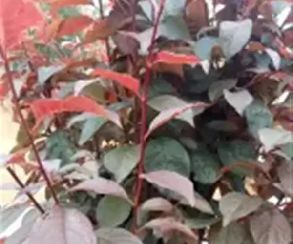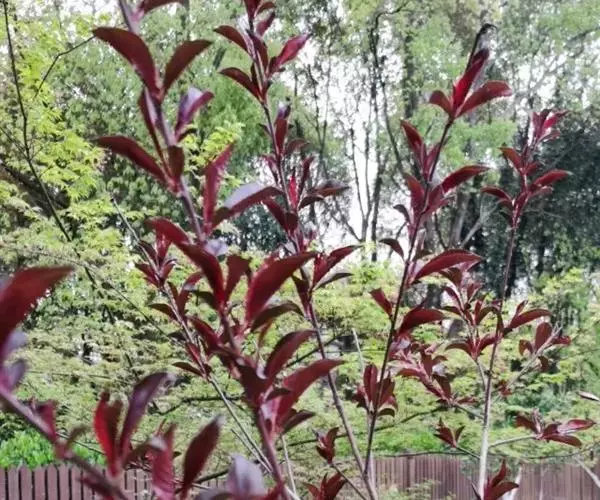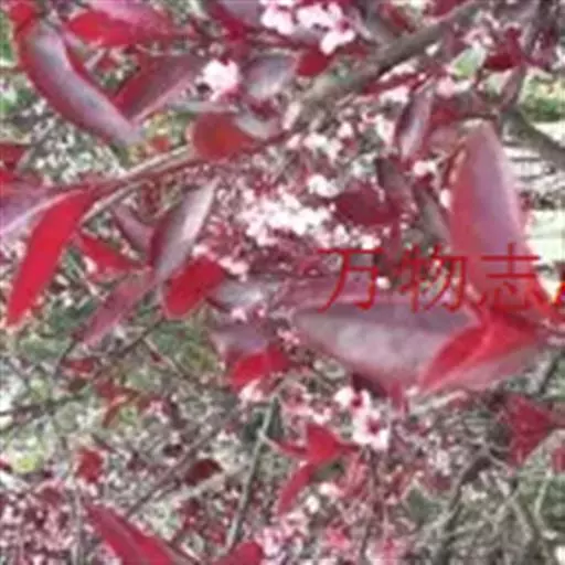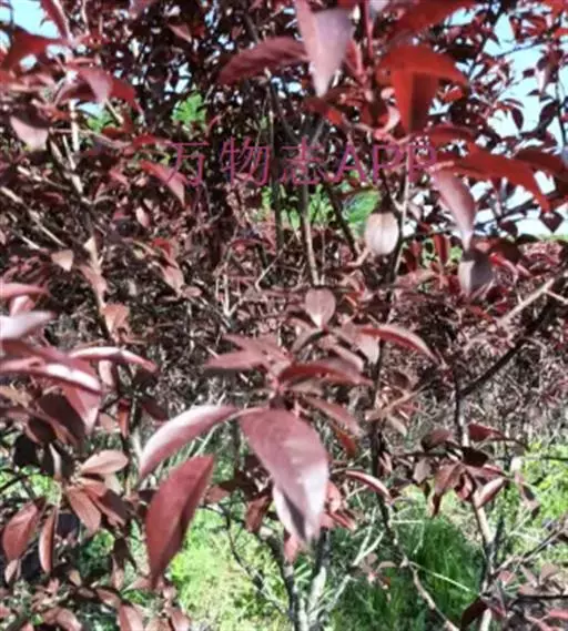 叶长卵形或卵状长椭圆形,长4-8厘米,先端渐尖,叶基部广楔形,叶缘有不整齐的细钝齿,叶面红色或紫色,背面色彩更红,新叶顶端鲜紫红色,当年生枝条木质部红色。花单生,中等偏小,淡粉红色,花瓣5片,微香,雄蕊多数,单雌蕊,花期4-5月。