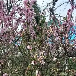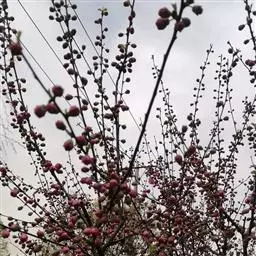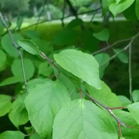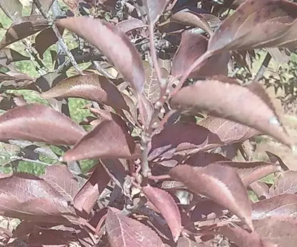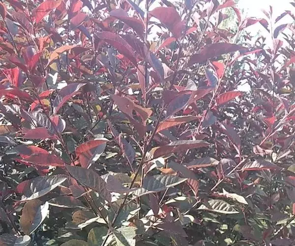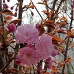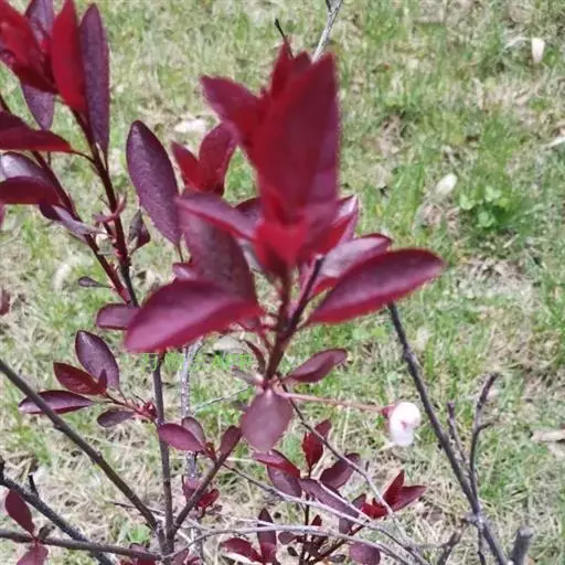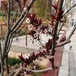 紫叶矮樱 紫叶矮樱为落叶灌木或小乔木,高达2.5米左右,冠幅1.5米至2.8米。枝条幼时紫褐色,通常无毛,老枝有皮孔,分布整个枝条。
