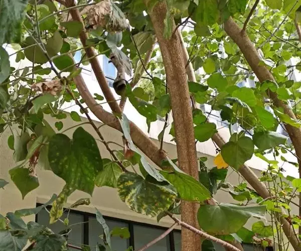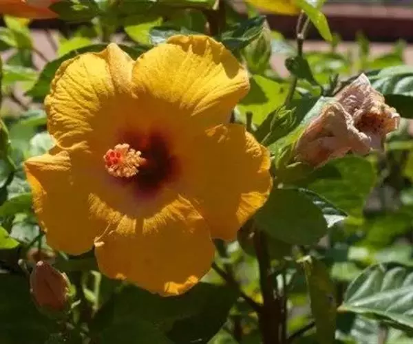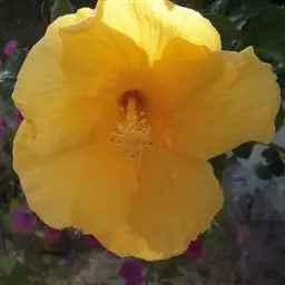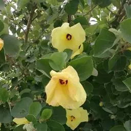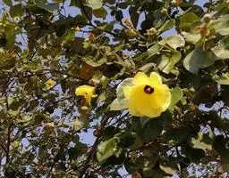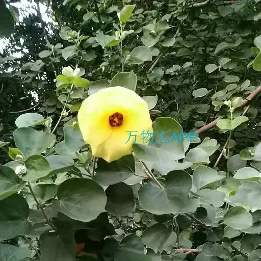 黄槿(学名:Hibiscus tiliaceus Linn.)是锦葵科木槿属植物,常绿灌木或乔木,高4-10米,胸径粗达60厘米;树皮灰白色;小枝无毛或近于无毛,很少被星状绒毛或星状柔毛。叶革质,近圆形或广卵形,直径8-15厘米,先端突尖。花序顶生或腋生,常数花排列成聚散花序,总花梗长4-5厘米,花梗长1-3厘米,基部有一对托叶状苞片。蒴果卵圆形,长约2厘米,被绒毛,果爿5,木质;种子光滑,肾形。花期6-8月。
