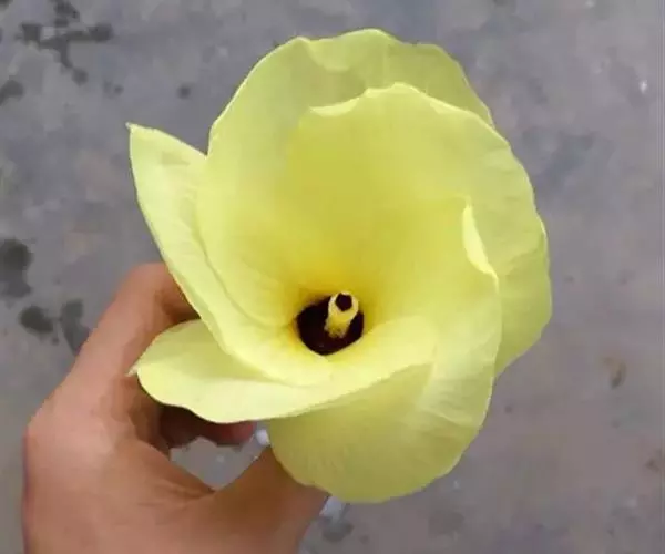 花序顶生或腋生,常数花排列成聚散花序,总花梗长4-5厘米,花梗长1-3厘米,基部有一对托叶状苞片;小苞片7-10,线状披针形,被绒毛,中部以下连合成杯状;萼长1.5-2.5厘米,基部1/3-1/4处合生,萼裂5,披针形,被绒毛;花冠钟形,直径6-7厘米,花瓣黄色,内面基部暗紫色,倒卵形,长约4.5厘米,外面密被黄色星状柔毛;雄蕊柱长约3厘米,平滑无毛;花柱枝5,被细腺毛。蒴果卵圆形,长约2厘米,被绒毛,果爿5,木质;种子光滑,肾形。花期6-8月。