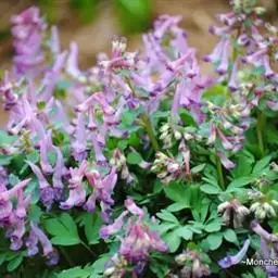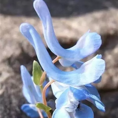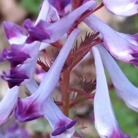多年生草本,高10-35厘米,上升或近直立。块茎圆球形或长圆形,直径(1.5-)3-4厘米,质淡灰色。茎基部以上具1鳞片,不分枝或鳞片腋内具1小枝,常具2叶。叶苍白色,较厚,叶柄短,约等于叶片长的1/3,叶片二回三出,具全缘或深裂小叶,裂片卵圆形至披针形,常急尖。总状花序明显高出叶,具5-25花(栽培条件下常多达30花),先密集,后疏离。苞片卵圆状披针形至线状披针形,全缘,约与花梗等长。花梗纤细,长5-15毫米,果期长达10-20毫米。萼片小。花红紫色,狭而长。外花瓣狭,渐尖,具色暗的纵脉而龙骨状突起部位尤为明显。上花瓣长3-4厘米;距长2.1-2.8厘米,渐狭,直或末端常弯曲;蜜腺体长约5毫米,钝。下花瓣直,无囊。内花瓣1.4-1.6(-1.8)厘米,顶端暗紫色。柱头近四方形,具6-8乳突,基部下延。蒴果线形,长1.8-2.5厘米,宽2-3毫米,具4-8种子。种子平滑,长约2.5毫米,稍狭,种阜带状,长而狭,基部淡棕色。