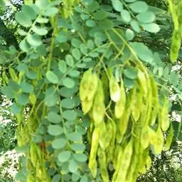 荚果无毛,长圆形至带状,扁平,长3-6厘米,宽1-2厘米,顶端急尖,基部钝或楔形,具稍长的果颈,果瓣革质,对种子部分有网纹,有种子1 (-2)粒;种子肾形,扁平,长约10毫米,宽约6毫米。花期4-5月。