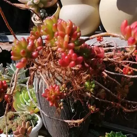 玉米石是景天科、景天属植物。多年生草本多浆植物。植株低矮丛生,多分枝。叶膨大成圆筒形、卵形或近小球形,…