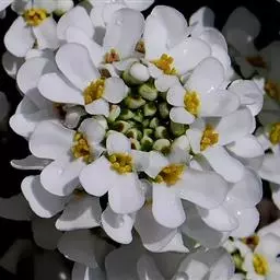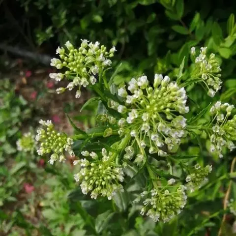 总状花序顶生,花多数;萼片长卵形,长2-3毫米,宽约1毫米,边缘膜质,基部略呈囊状;花瓣白色,倒卵形或宽是形,具脉纹,长3-4毫米,宽1-1.5毫米,顶端圆,基部渐狭成细爪。
