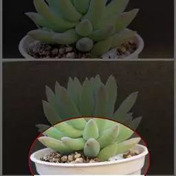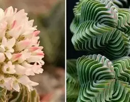 叶子表面宽厚,富肉质感且带有磨纱质感,看像石头质地;开红色小花,生于植株顶部,倒伞形密生,形状像花…