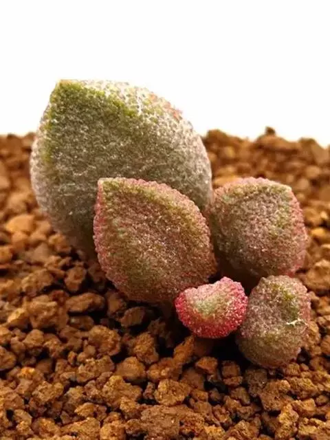 叶子表面宽厚,富肉质感且带有磨纱质感,看像石头质地;开红色小花,生于植株顶部,倒伞形密生,形状像花…